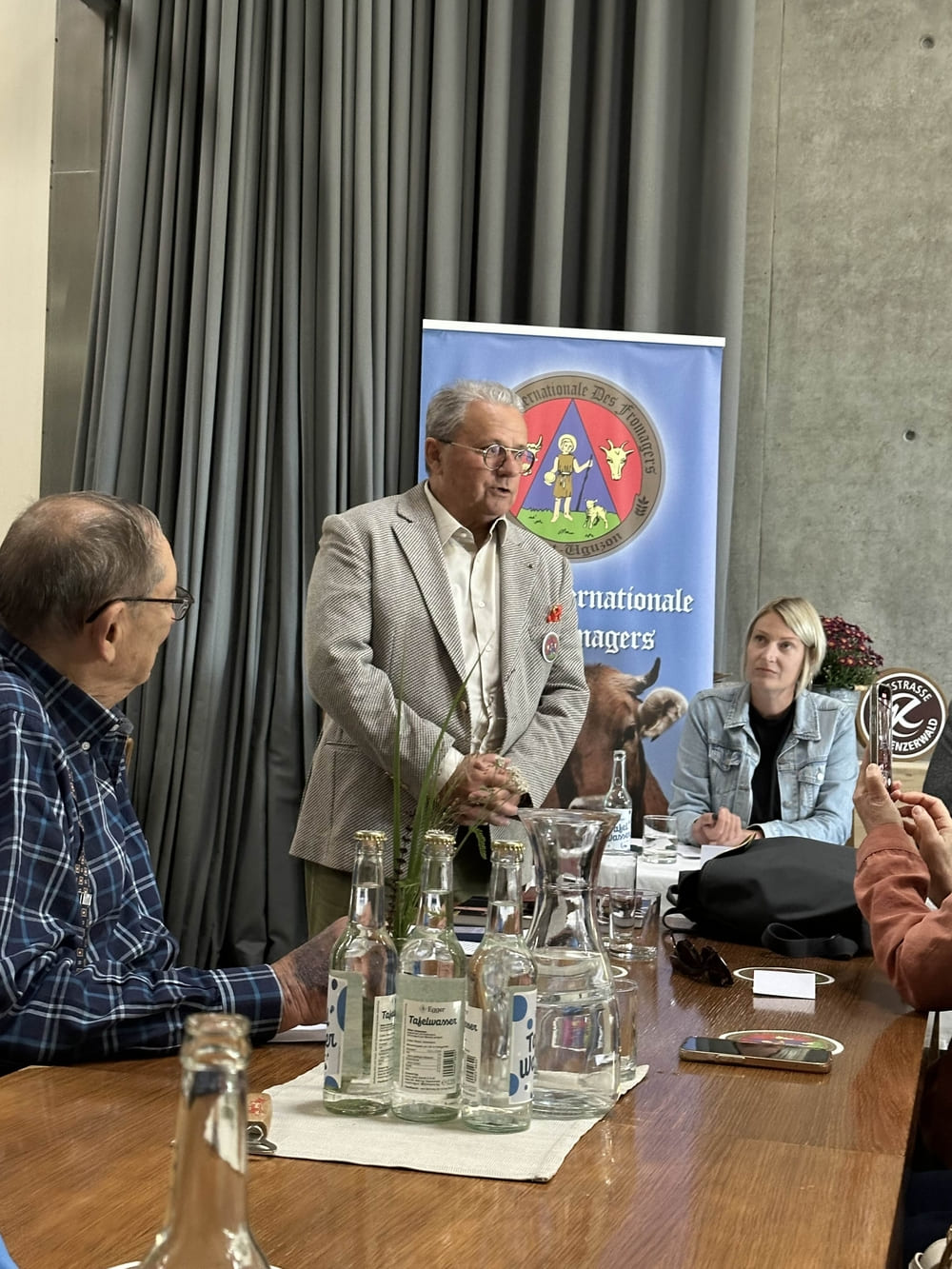 Dann ging es schon los. Markus Böhmer stellt Birgit Haupt, Käse Reuter, offiziell den anderen Mitgliedern vor, mit kleinem Einblick in ihre Käse-Karriere. Seit Jahrzehnte arbeitet Birgit in der Käsebranche und hatte von Anfang an eine Liebe zur Rohmilch entwickelt. Sie ist Käsesommelière und Inhaberin von Käse Reuter. Und nun ist es soweit: Mitsamt Auszeichnung ist sie nun auch Gardé et Juré der Guilde Internationale Saint Uguzon!