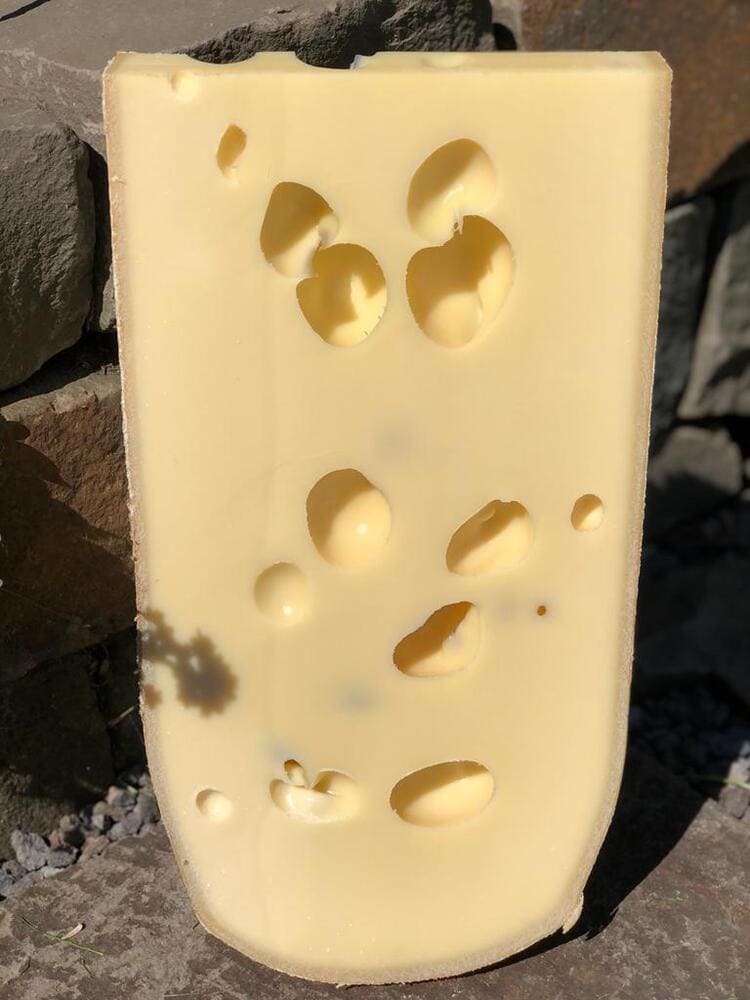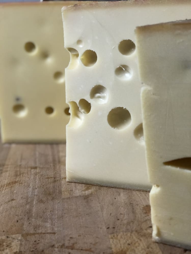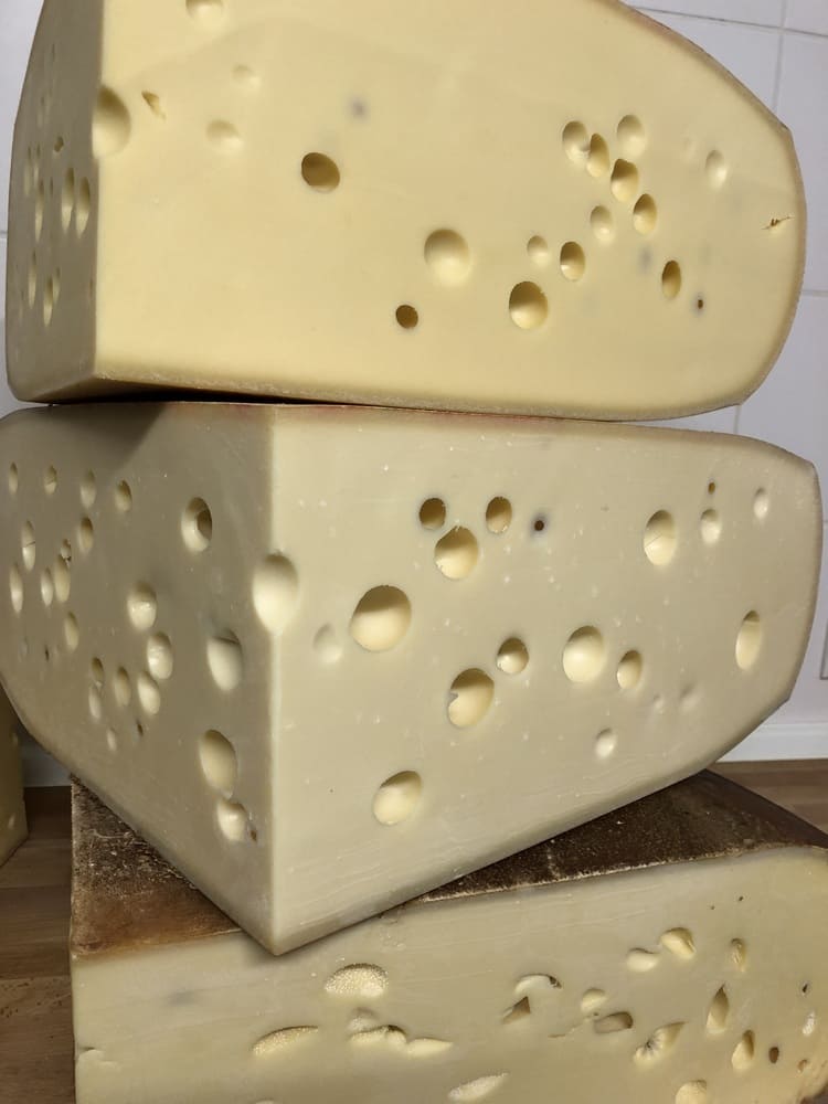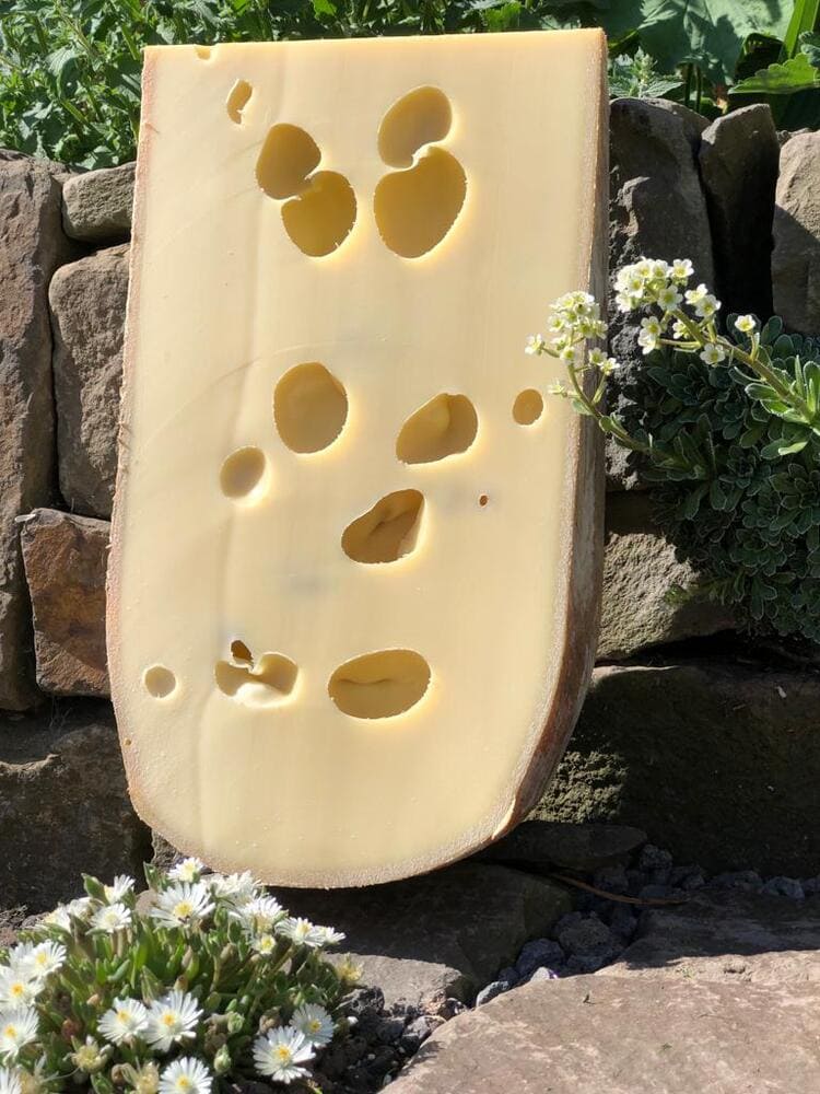 So soll ein Emmentaler schmecken! Zwischen nussig & fruchtig, duftend nach frischem Heu! Bei längerer Reifung bilden sich Salzkristalle &ein intensiveres Aroma.